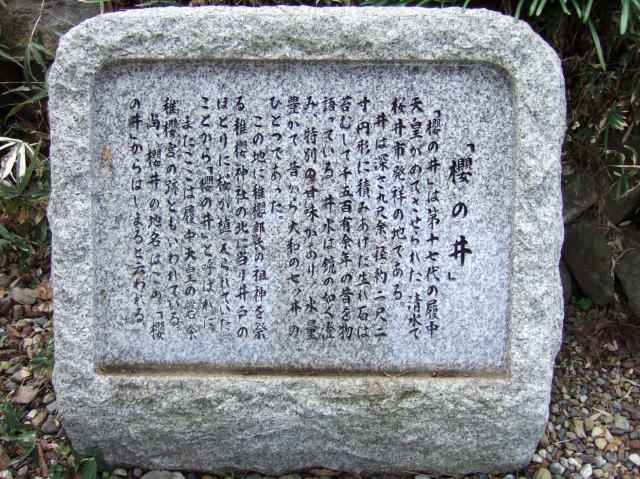| 皆花楼の南2〜300mのところに「若櫻神社」という由緒ある神社があります。 その北10mほどの、道路から少し入ったところに「櫻の井」があります。 「桜井」の地名のもとになった井戸だそうです。 |