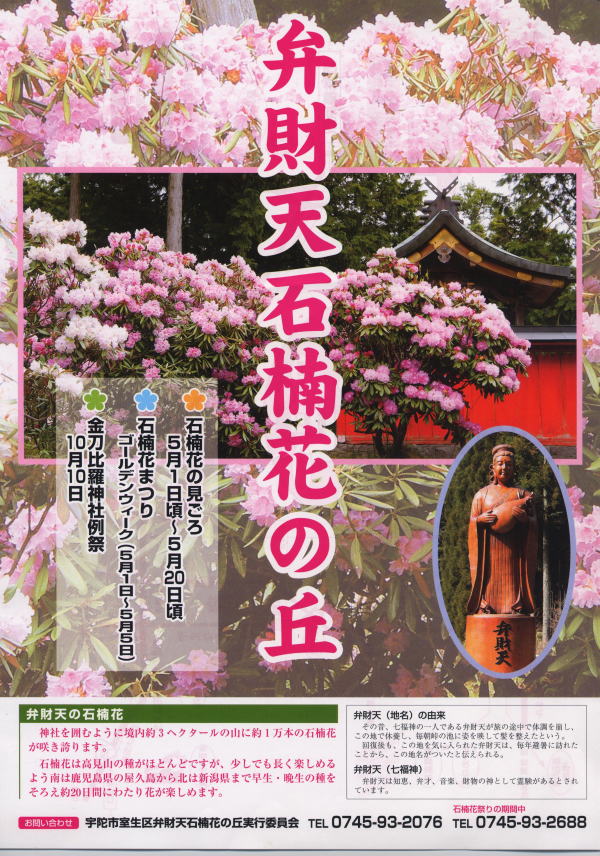| 「石楠花」と言えば、最近「弁財天の石楠花」の案内が目立つようになりました。 桜井の隣町、宇陀市が色々な趣向で活性化を図っています。 室生寺の「石楠花」が有名ですが、この弁才天もこの時期の見所に成長するのではないでしょうか? 一度訪問したいと思いながらまだ実現していませんがこの春にはと思っています。 桜井よりは山手になるので暫くは見頃が続くと思います。 (画像をクリックで拡大と、アクセスの説明も・・・) |